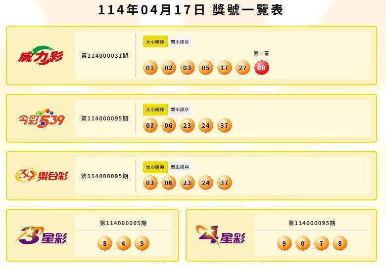 確切中獎號碼以台彩網站公告為主,請見「台灣彩券網站」。
