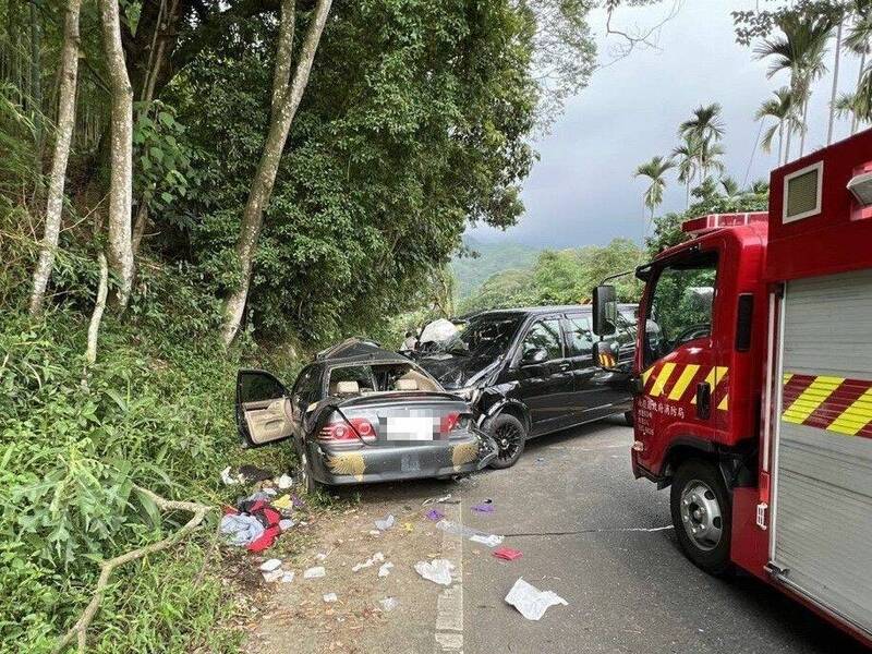 南投溪頭聯外道路發生嚴重對撞車禍。(記者劉濱銓翻攝)