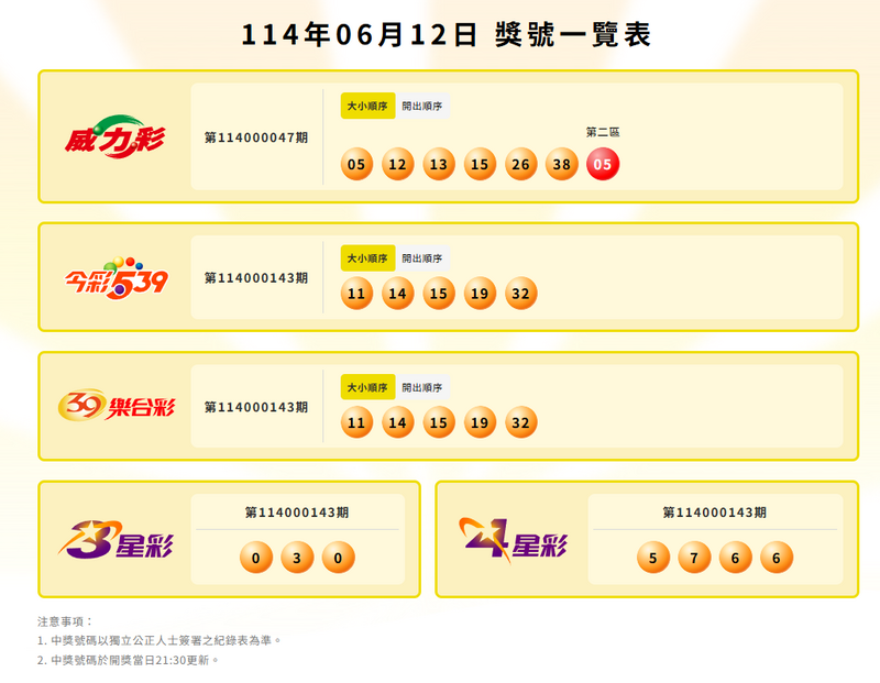 確切中獎號碼以台彩網站公告為主,請見「台灣彩券網站」。