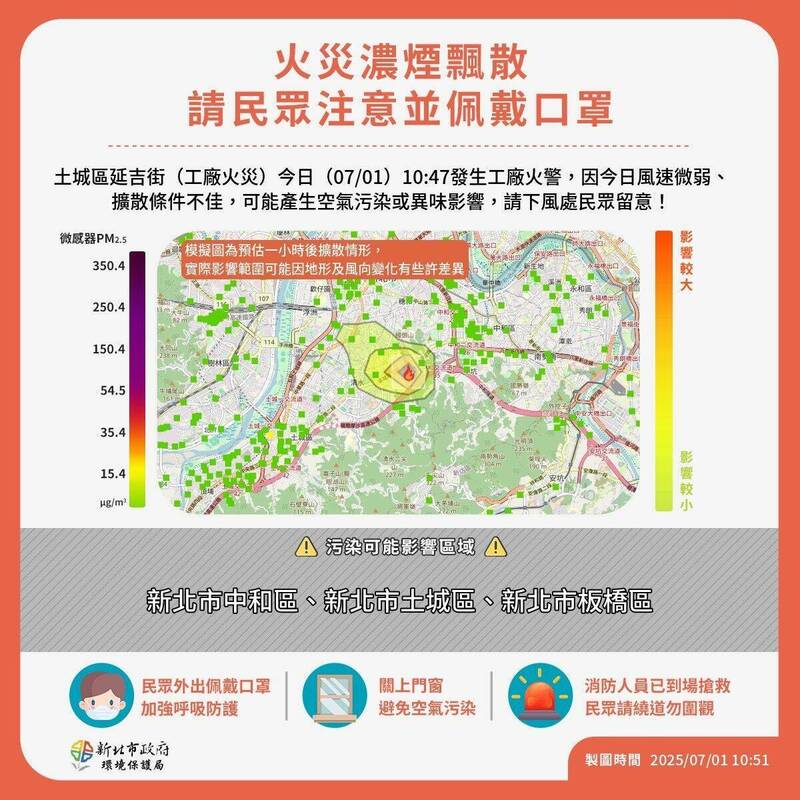 新北市環保局指出,今天風速微弱,擴散條件不佳,經模擬主要可能影響範圍為新北市中和區、土城區、板橋區,請鄰近民眾緊閉門窗,待火勢撲滅後再開窗,外出記得戴上口罩。另因大氣條件變化快,將持續監控更新空品變化,啟動相關應變作為。