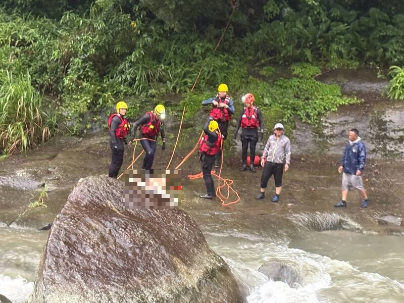 新竹縣政府消防局尖石分隊同仁把陳男從溪流中帶上岸,但發現他已明顯死亡。(竹縣府消防局提供)
