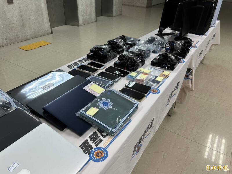 警方查扣手機、電腦主機、平板電腦、筆電、電腦螢幕、名片、印章、人事規章1批、合約書等大批贓證物。(記者邱俊福攝)