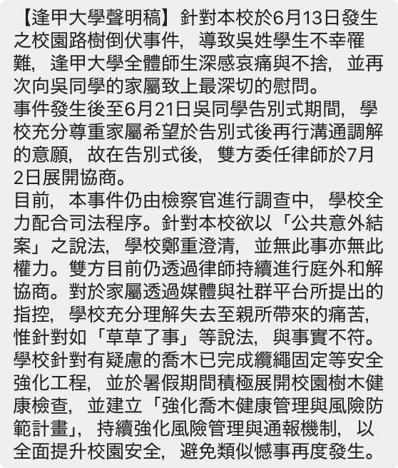 對此,逢大表示,深感哀痛與不捨,並再次向吳同學的家屬致上最深切的慰問;事件發生後至6月21日吳同學告別式期間,學校充分尊重家屬希望於告別式後再行溝通調解的意願,故在告別式後,雙方委任律師於7月2日展開協商。