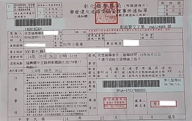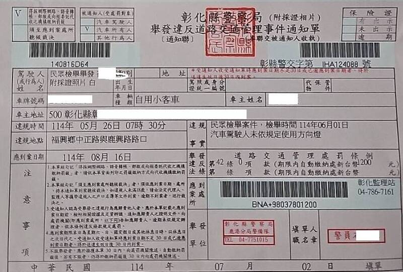 在彰化縣鹿港、福興交界的中正路,因方向燈未打好打滿,被開罰1200元。(民眾提供)