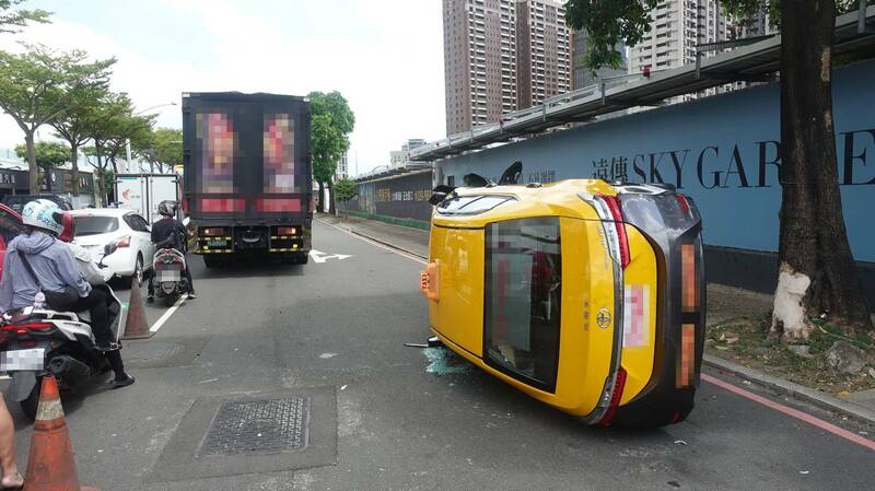 桃園區國際路二段與慈文路,11日發生大貨車、計程車事故,計程車側翻在路邊。(記者鄭淑婷翻攝)