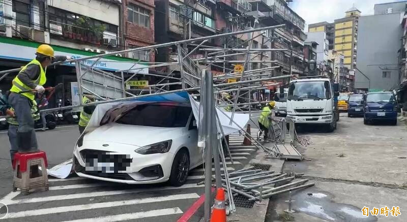 基隆中船路一宮廟宣傳活動搭建的鷹架被強風吹倒壓到一輛小客車。(記者盧賢秀攝)