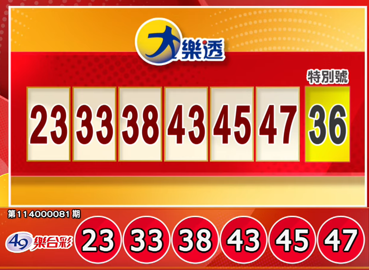 大樂透:23、33、38、43、45、47,特別號:36。