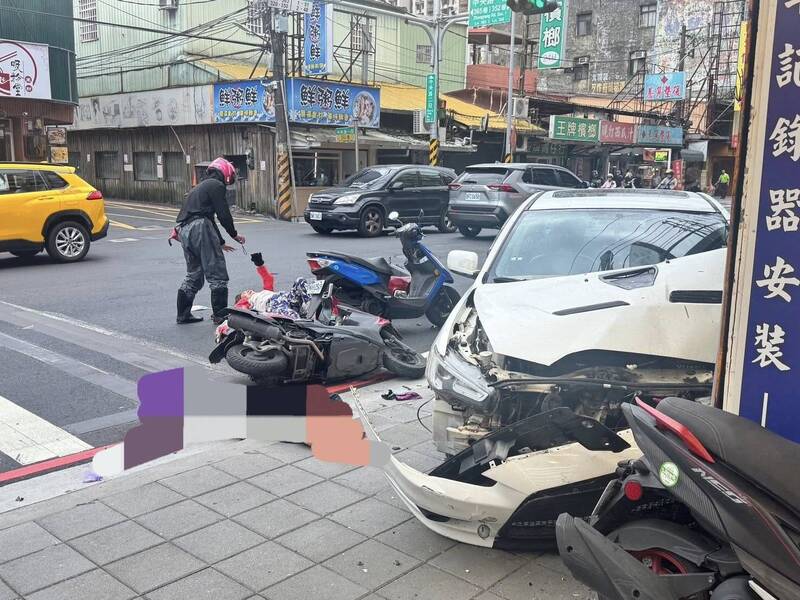 汽車失控造成連環車禍,5部機車被撞倒。(記者徐聖倫翻攝)