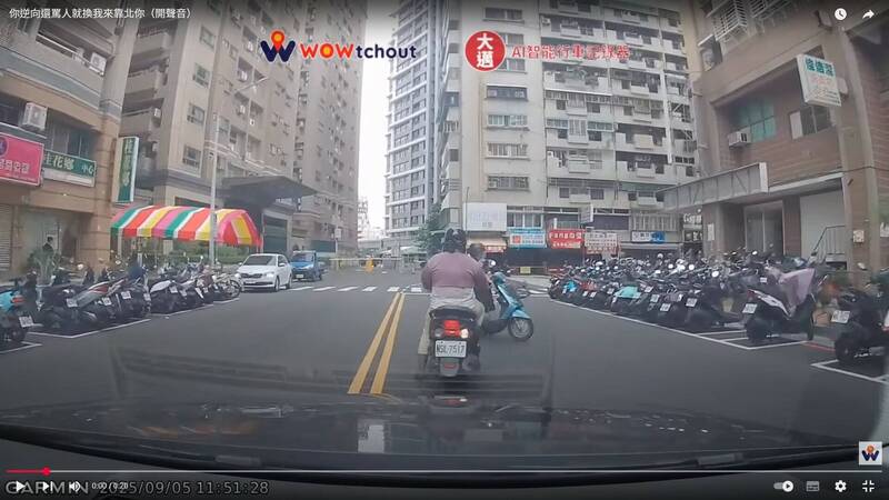 這段逆向停車案例發生在5日,影片今天被上傳youtube頻道「WoWtchout」,騎士自路邊起步後,未依導引線維持既有車道,直接切入對向來車道,迫使對向車輛緊急減速閃避,雙方停車理論數十秒後各自離去。