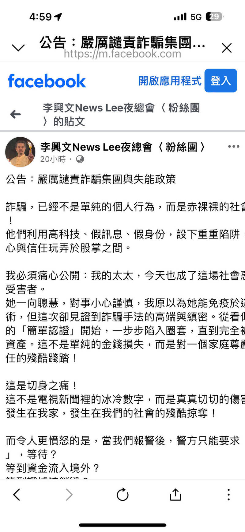李興文因妻子網路交易遭詐騙損失,PO文「嚴厲譴責詐騙集團與失能政策」。(記者吳仁捷翻攝)