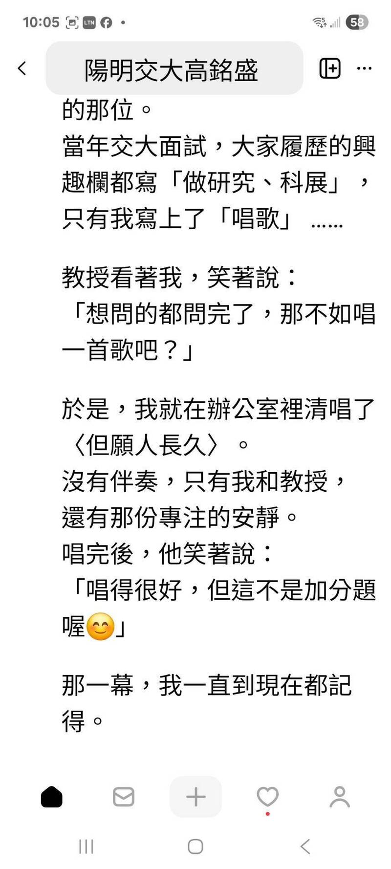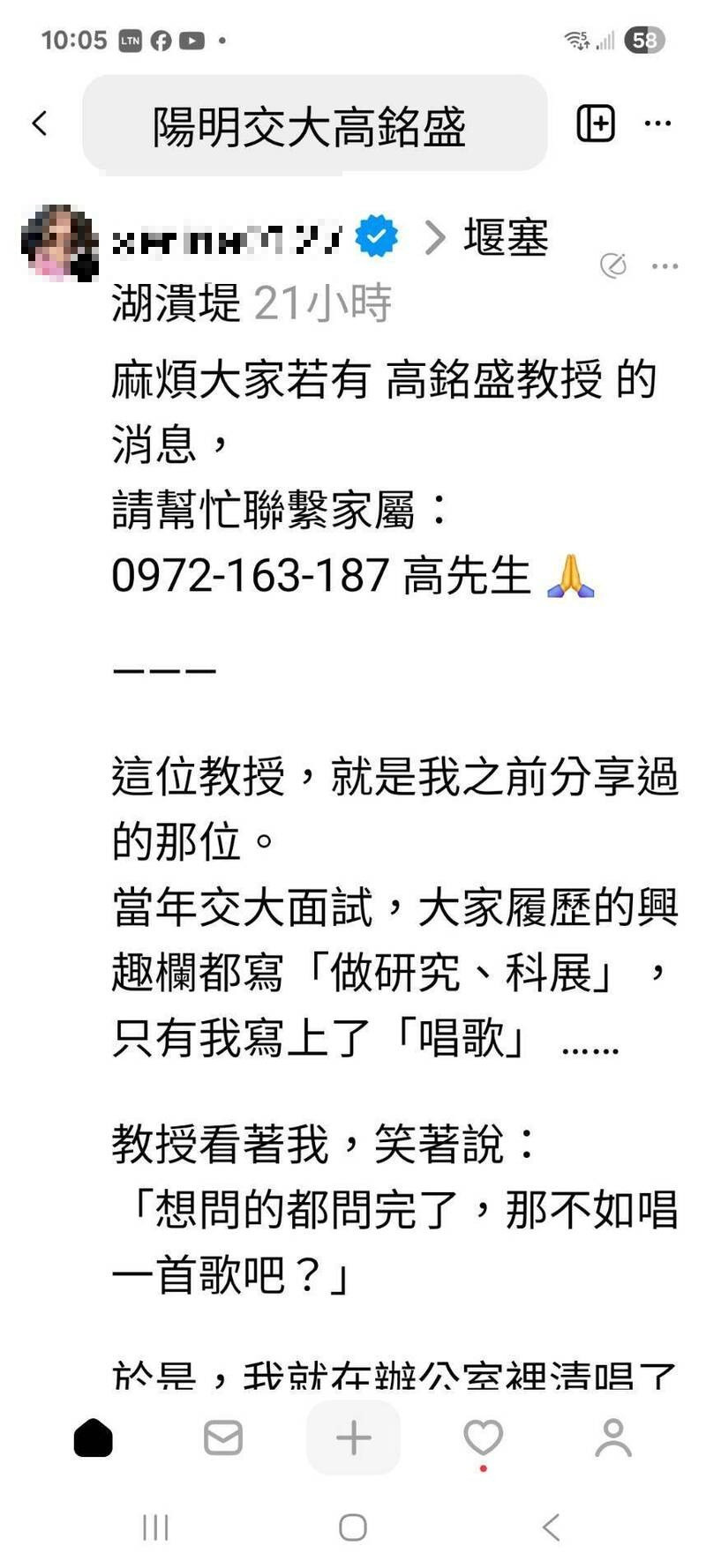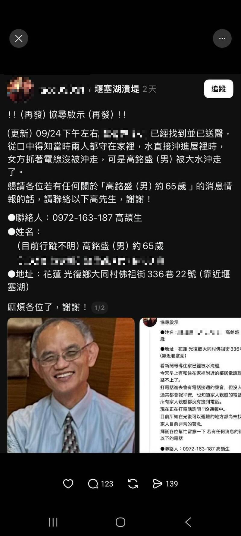 陽明交大退休教授高銘盛在花蓮馬太鞍堰塞湖潰流災情的失聯名單中,家人與師生在網路串聯協尋,祈奇蹟出現。(取自網路Threads)