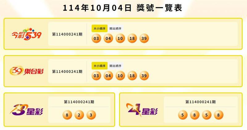 第114000241期39樂合彩中獎號碼為「03、04、10、18、39」,四合摃龜;三合共116注中獎,每注可得1萬1250元;二合共1萬3067注中獎,每注可得1500元。