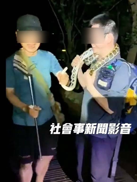 山友將保育類「黑眉錦蛇」掛在脖子上拍照留念。(來源社會事新聞影音)