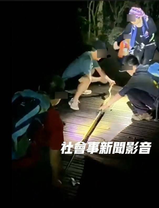 一行人逗蛇嬉鬧,不但拍照、摸蛇,還拉長「黑眉錦蛇」,以登山杖比對,測量長度大約2公尺外,還有人開玩笑「每人摸一下、每人親一下!」