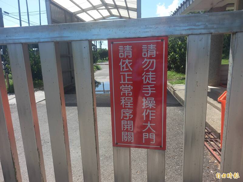意外發生後,軌道門加掛「請依正常程序開關,請勿徒手操作大門」告示牌。(記者江志雄攝)