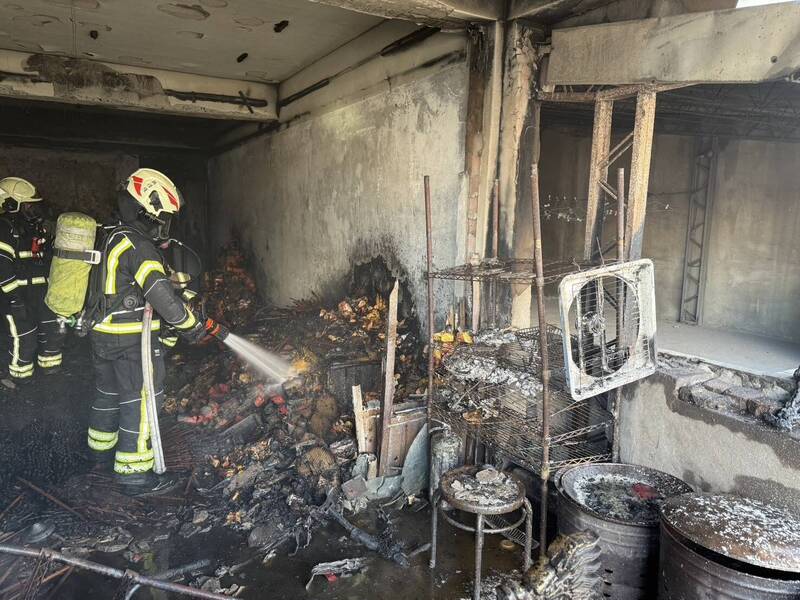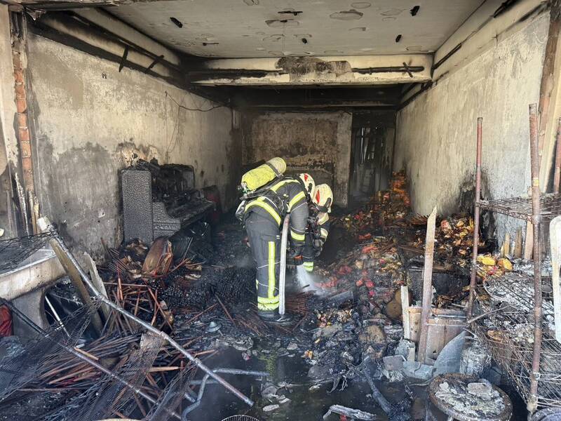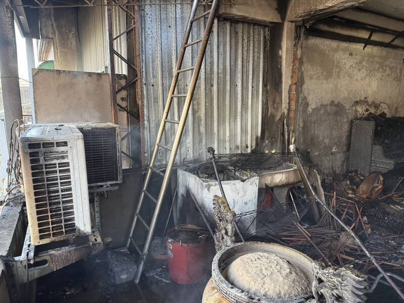 中壢龍岡地下道旁民宅焚燒金紙冒火,現場燒毀神明桌、冷氣及民生用品。(記者李容萍翻攝)