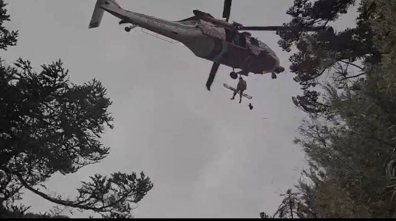 空勤總隊連日來出動直升機,卻因天候不佳,搜救人員改以人力背運方式,護送至排雲山莊,今天把握短暫透空時機,將郭姓校長吊掛下山。(市府提供)