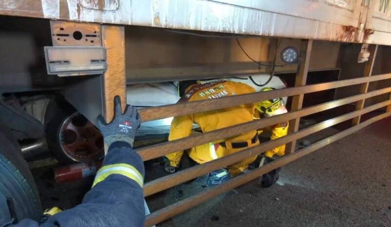 內側車道47歲顏男駕駛的白色轎車被聯結車壓在車底,他意識清楚,肢體挫傷,車內11歲女童、40歲女子輕傷,一家三口逃過一劫,讓趕到車禍現場的顏男小舅子鬆了一口氣。