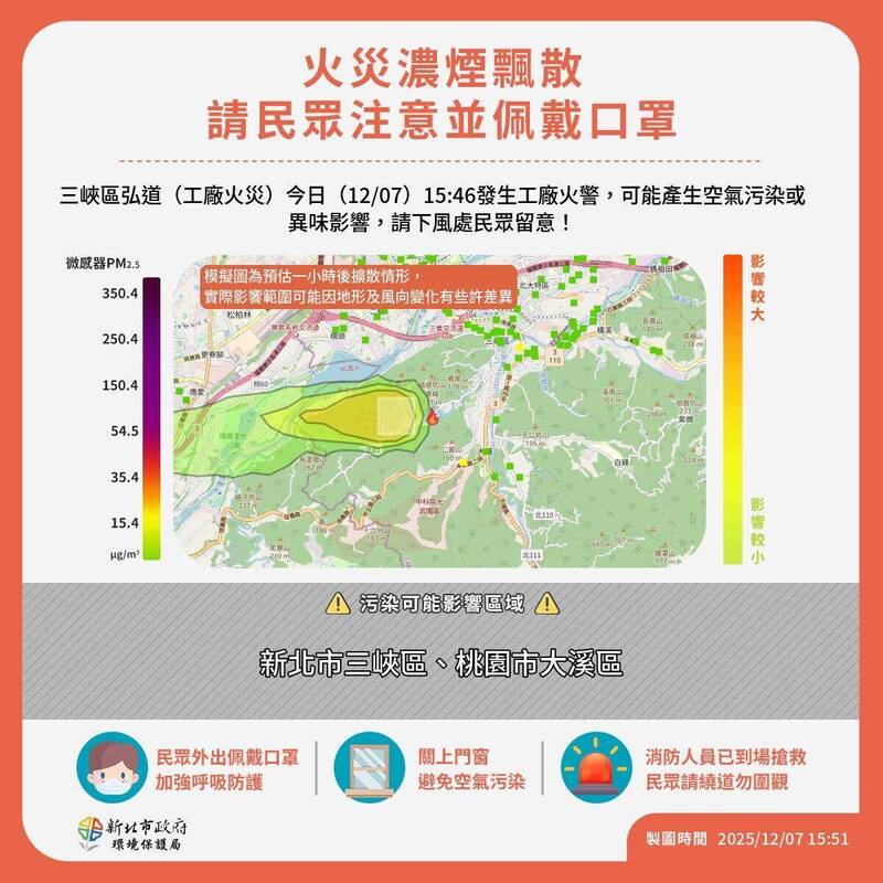 新北市環保局提醒下風處的三峽區與桃園市大溪區暫先關上門窗、民眾外出配戴口罩。(新北市環保局提供)