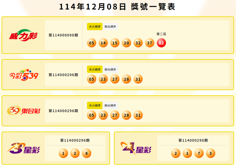 確切中獎號碼以台彩網站公告為主,請見「台灣彩券網站」。