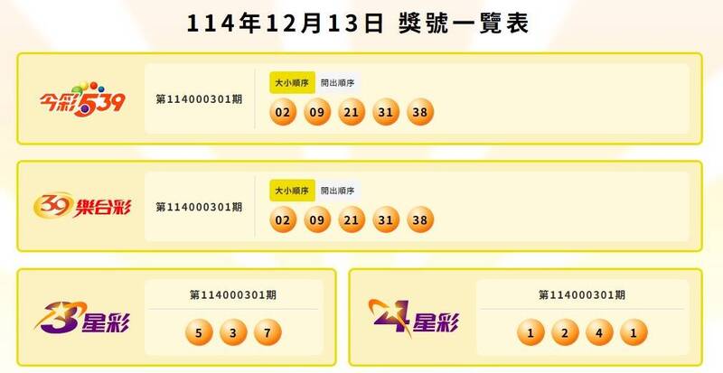 確切中獎號碼以台彩網站公告為主,請見「台灣彩券網站」。