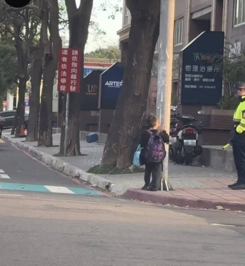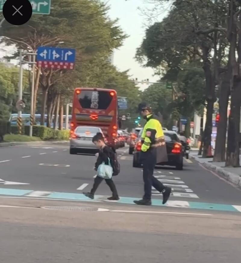 竹北分局三民所警員林冠廷陪小男童穿越馬路後折返準備回到服勤崗位,小男童則繼續走路上學去。(取自網路)