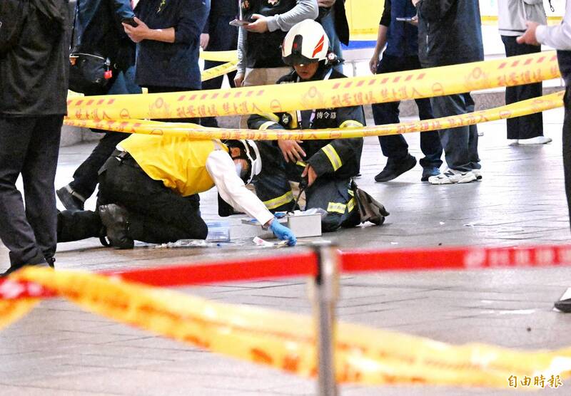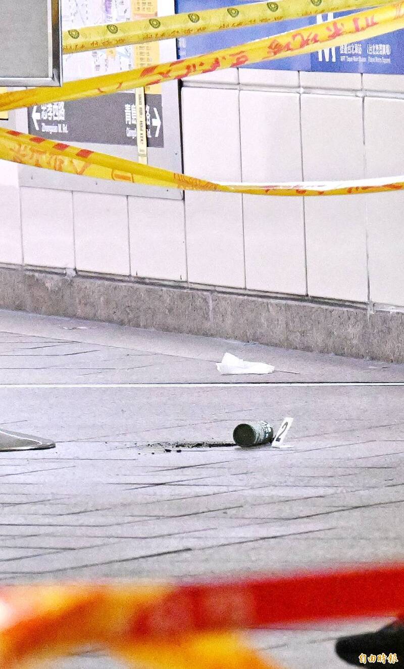 嫌犯張男在台北車站丟煙霧彈,警方到場蒐證。(記者方賓照攝)