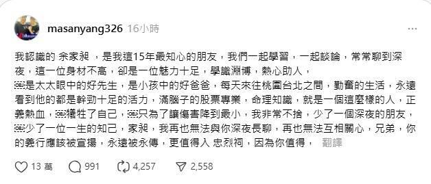 通緝犯張文在前天犯下舉國震驚的台北捷運隨機殺人案,他的手段雖然兇殘,可是在這場恐怖的事件中,首位被張文殺害者,其實相當英勇。這位被害人是余家昶,他不僅率先發現張文的犯行,更捨命攔阻、破壞了張文一整箱的汽油彈。今天有網友發文說,余其實並非保全,而是從事金融業,平時熱心助人,更希望他的義行永傳、入忠烈祠。