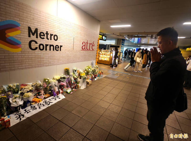 捷運台北車站M7出口民眾獻花合掌悼念英勇制敵不幸犧牲的余家昶。(記者王藝菘攝)