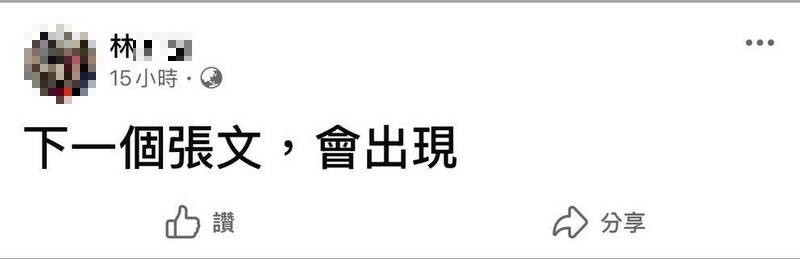 「下一個張文,會出現」正當部份民眾仍處在北捷連續攻擊案的恐懼中,多處傳出不法分子刻意自稱「張文同夥」,一位署名earthquake12time的網友在Threads上留言,「這次是台北車站和中山站發生恐怖攻擊事件,我推測下次發生恐怖攻擊事件的可能地點:下一站:板橋、府中、浮洲、新埔…」由於預告8波攻擊涵蓋北捷、台鐵39個車站,引起林口警方關切,警方獲報組成專案小組調查,經分析比對相關資料,確認貼文者為林姓男子,隨即報請檢察官指揮偵辦,今天下午1時許持拘票到桃園逮人,全案依恐嚇公眾罪嫌移送桃園地檢偵辦。