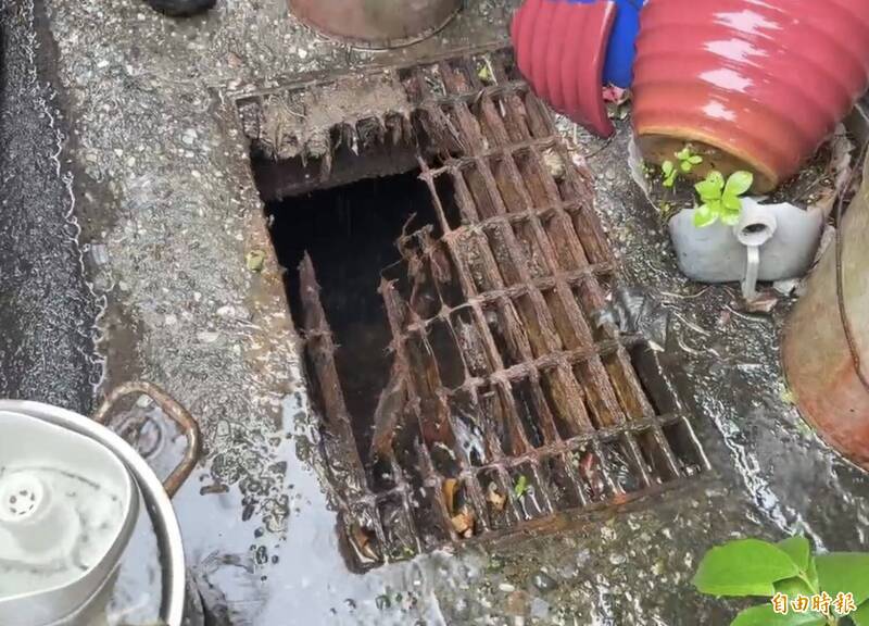 基隆市基金一路水溝蓋鏽蝕,民眾踩空小腿受傷縫了30幾針。(記者盧賢秀攝)