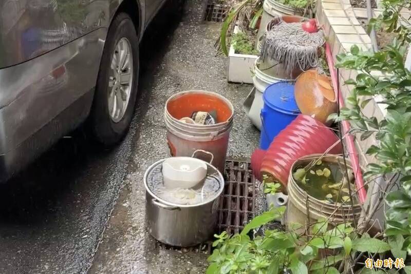 基隆市基金一路水溝蓋鏽蝕害民眾受傷,民眾拿鍋子、水桶圍起來避免其他人受傷。(記者盧賢秀攝)
