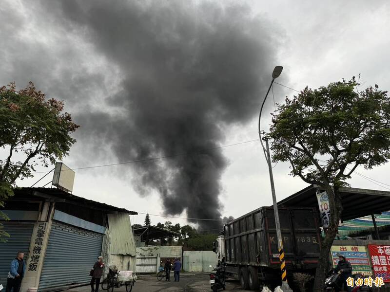 中和民享街一處鐵皮工廠發生火災,地點鄰近學校,濃煙恐影響孩子上課。(記者賴筱桐攝)