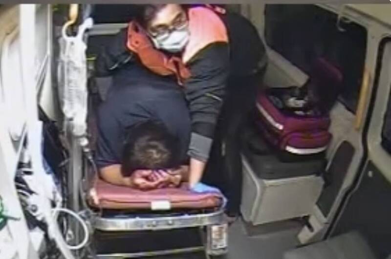 即使救護車狂飆、搖搖晃晃,救護人員全程站起按壓,以免臟器整個流出。(警消提供)