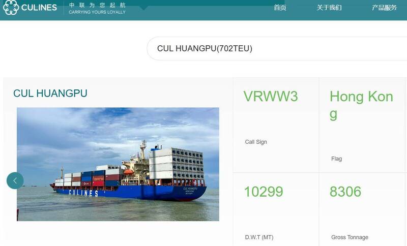 香港籍貨櫃輪「中聯黃埔」(CUL HUANGPU)6日上午8時許行經新北市石門區東北方9.5浬處,船上23個空貨櫃被大浪打落。(圖擷取自中聯航運官網)