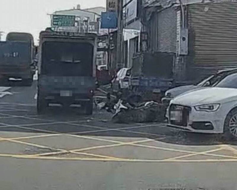 就差1秒鐘,女童(紅圈)險遭一旁的貨車輾爆頭。(圖由民眾提供)