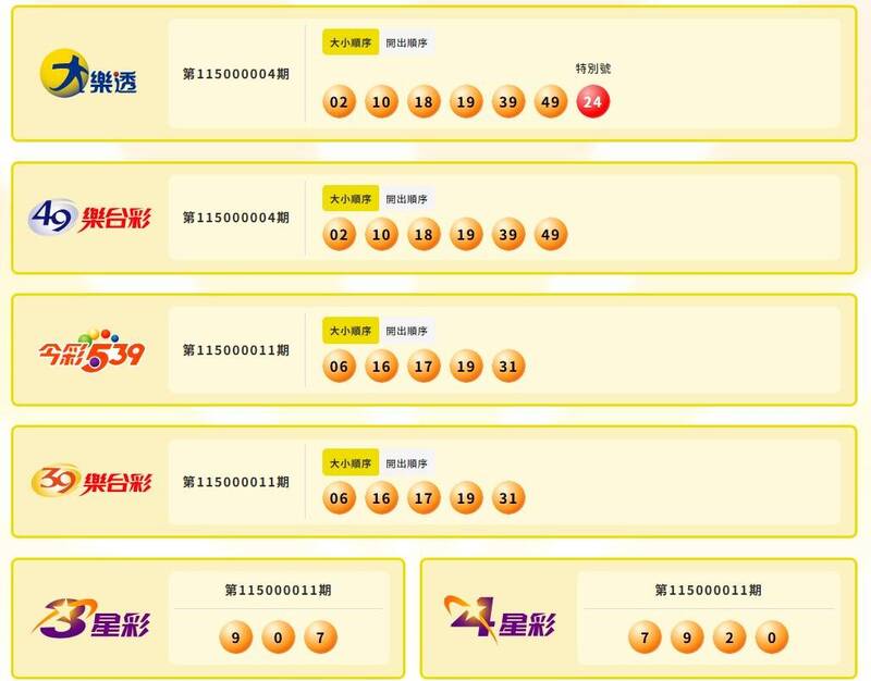 大樂透、49樂合彩、今彩539、39樂合彩、3星彩、4星彩中獎號碼。(擷取自台彩官網)