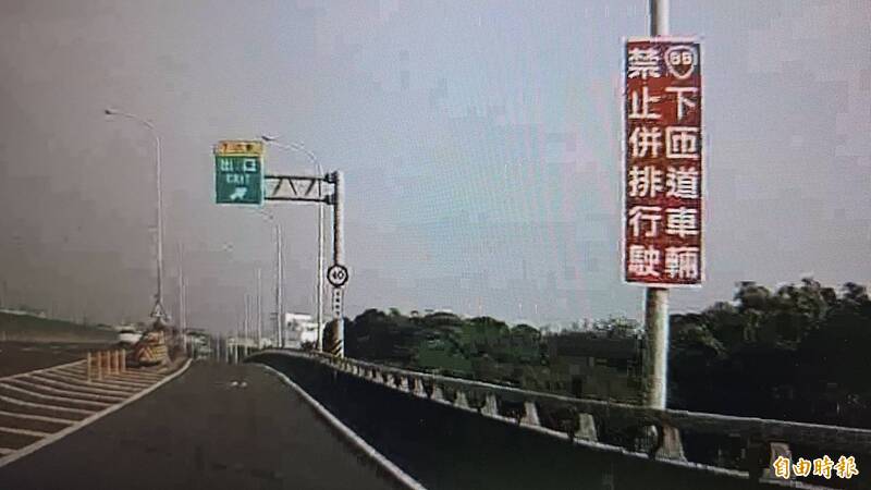台88快速道路設警示牌,禁止下匝道車輛併排行駛。(民眾提供)
