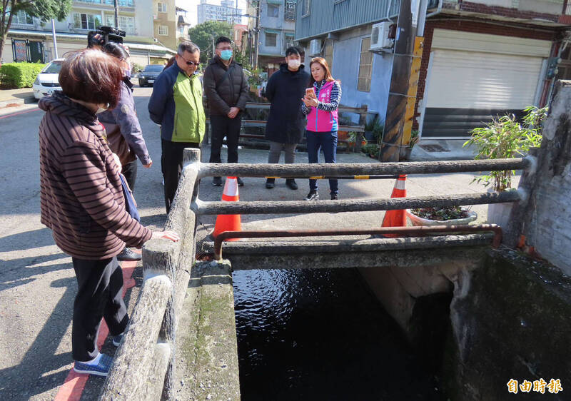 桃園市中壢區仁福公園旁的水溝護欄,因年久失修斷裂,有婦人摔落水溝受傷,市議員謝美英(右一)要求維管單位全面汰舊換新保障民眾安全。(記者李容萍攝)