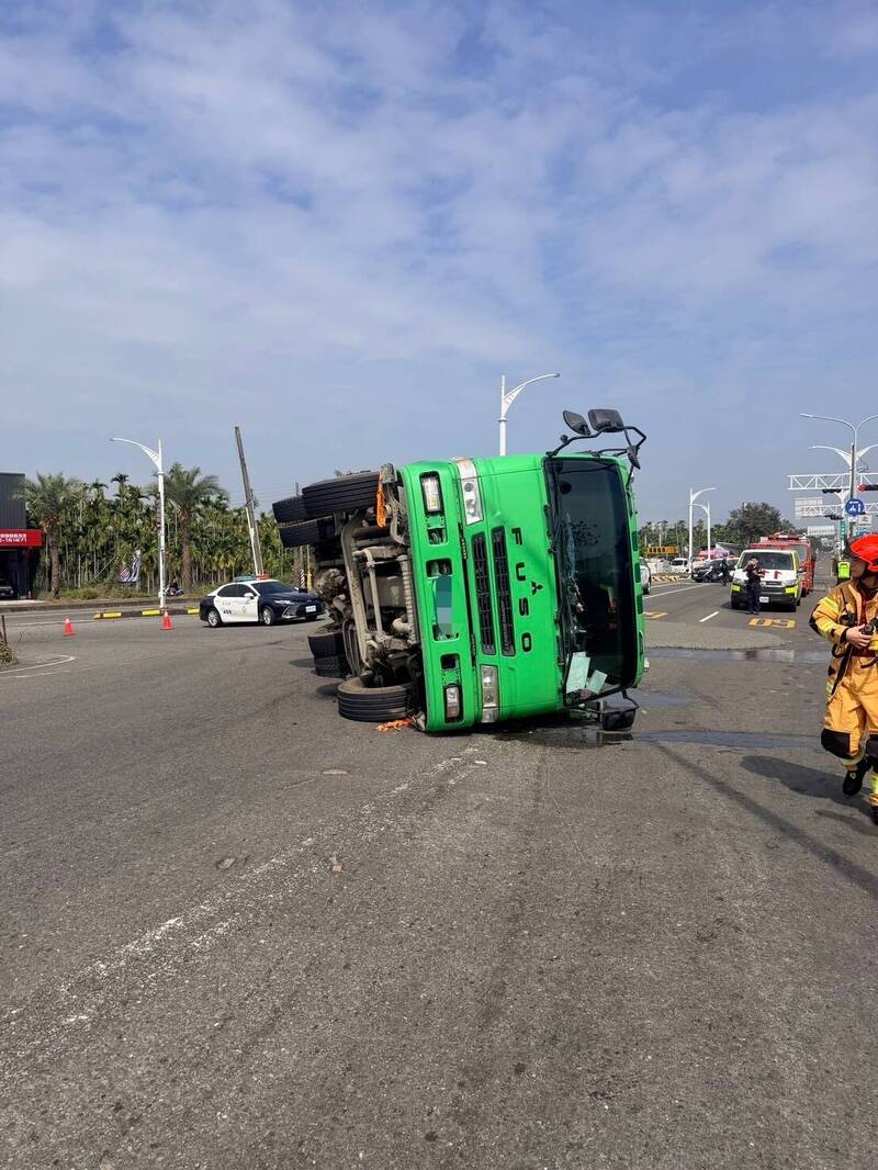 屏東縣警局潮州分局於今日上午11時27分接獲報案,指稱竹田鄉台一線與水源路口發生事故。初步調查,李姓男子當時正沿潮州路由西向東行駛,疑似在右轉銜接台一線南下車道時,車身突然失去平衡翻覆。所幸駕駛生命跡象穩定,但滿地的混凝土清理困難,目前潮州警分局已會同南區養護工程分局潮州工務段人員,在現場進行緊急道路清理與車體排除作業。