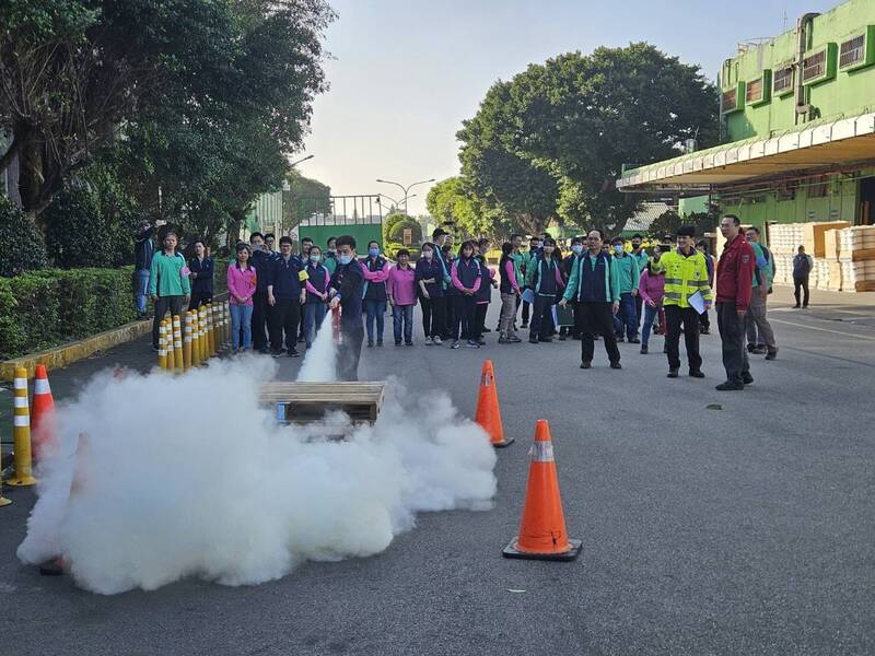 廠方的自衛消防編組,則分為5個班別進行實作,包括「通報班」即時傳遞火警資訊、「滅火班」操作室內消防栓與滅火器壓制火勢、「避難引導班」在廠區引導員工疏散、「安全防護班」管制並確認防火區劃作動情形、「救護班」設置傷患救護站等,再由消防隊員於過程中給予指導、檢討。