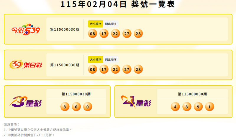 確切中獎號碼以台彩網站公告為主,請見「台灣彩券網站」。