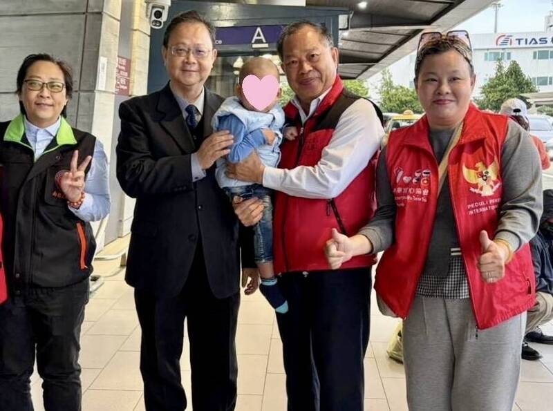 南投地檢署現任檢察長郭景東(左2)將調任橋頭地檢署檢察長,他在上月20日親送印尼寶寶搭機返回家鄉。(南投地檢署提供)