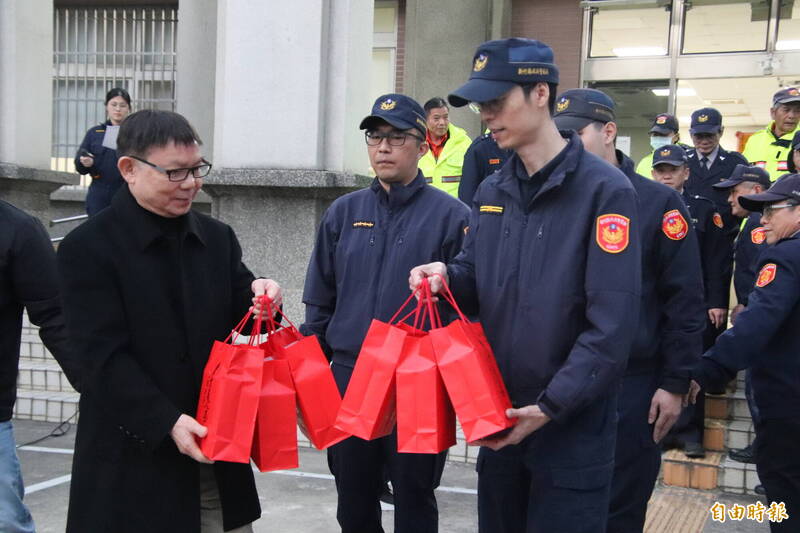 新竹縣議會議長張鎮榮(左1)體恤天寒地凍,警方春安工作辛苦,特別致贈優質東方美人茶,讓員警們下崗後可以泡茶暖暖身。(記者黃美珠攝)