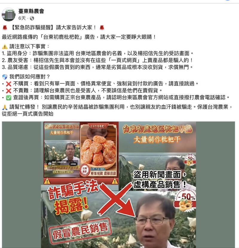 近日臉書(Facebook)頻繁出現一頁式詐騙廣告,影片主角竟是現任台東縣農會理事長楊招信。畫面中的他顯得相當年輕,身分標註為「傑出農民」,正在推銷一種台灣罕見的「竹鹽琵琶」。台東縣農會發現後立即發布聲明,提醒民眾切勿上當,而楊招信本人也出面拆穿這場荒謬的騙局。