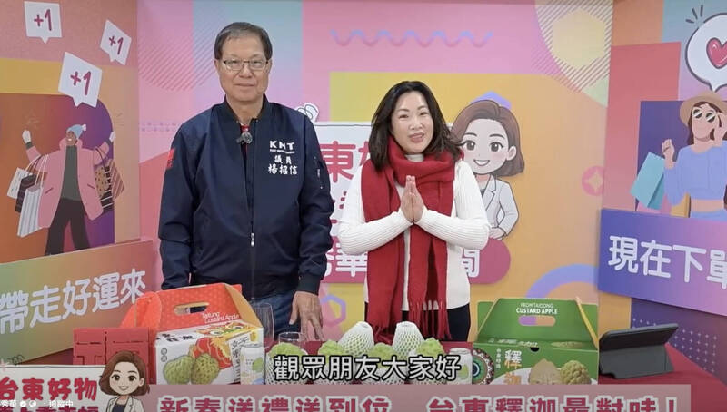 楊招信(左)現況,與議長吳秀華(右)推銷釋迦,這影片就絕非詐騙。(翻攝自吳秀華臉書)