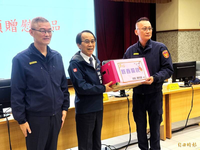 高雄市副市長林欽榮(中)與警察局長趙瑞華(左)為警長弟兄加油打氣,由苓雅分局長林俊賢(右 )代表受贈。(記者許麗娟攝)