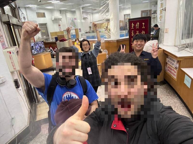 兩名澳洲背包客興奮的與警方合影留念。(警方提供)