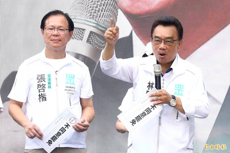 林國成(右)去年7月20日下午參加黨內舉辦「720民主起義 反罷要贏 台灣要贏」的公開集會活動時,手持麥克風罵總統賴清德三字經。(資料照,記者王藝菘攝)