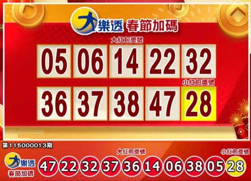大樂透春節大紅包:05、06、14、22、32、36、37、38、47,春節小紅包:28。